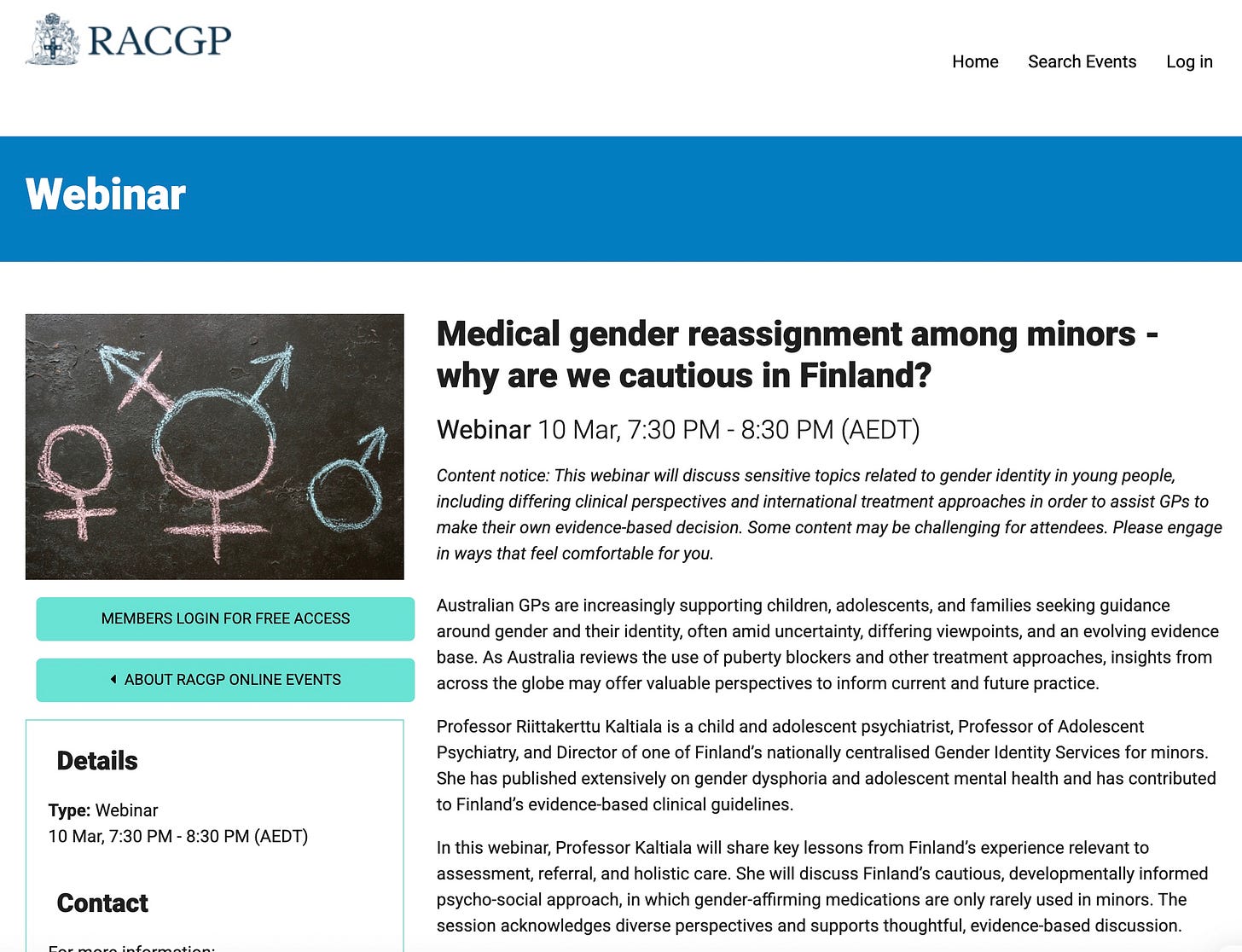 The well-subscribed March 10 webinar presentation by Finnish psychiatrist Riittakerttu Kaltiala—a leading clinician and researcher in the international shift away from routine “gender-affirming” medicalisation of minors—had been approved and advertised since the New Year by the Royal Australian College of General Practitioners (RACGP).1